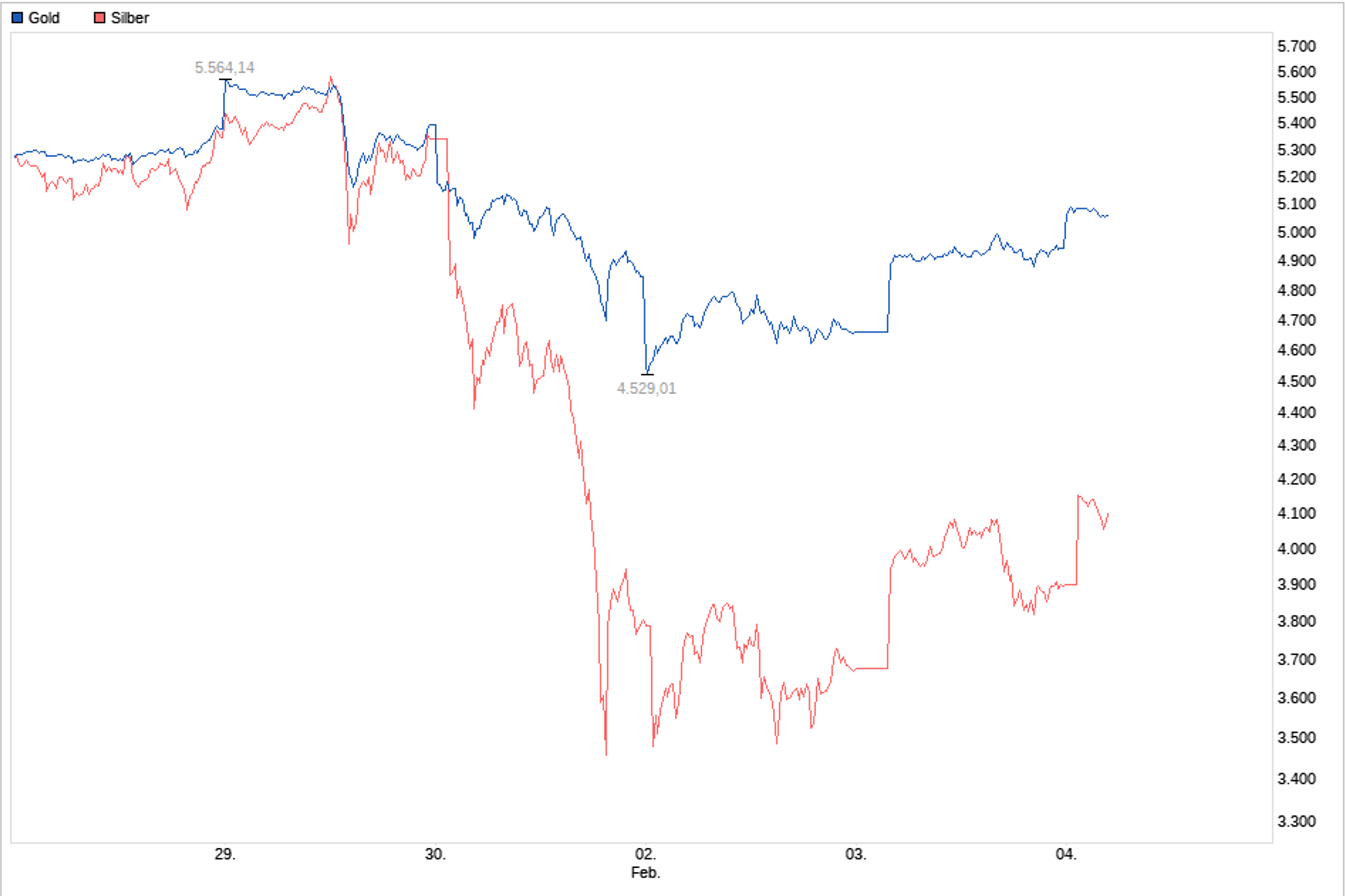Nachstehender Chart zeigt die außergewöhnliche Preisentwicklung von Gold (blau) und Silber (rot), stark beschleunigt in den letzten drei Monaten, das Bild darunter den Crash der letzten Tage: